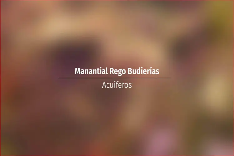 Manantial Rego Budierías. Acuífero en Asturias: Cuenca: Norte Unidad Hidrogeológica: Unidades aisladas Sistema acuifero: Acuífero aislado Toponimia: Rego Budierías Cota: 720 Naturaleza: Manantial Uso: Abastecimiento a núcleos ...